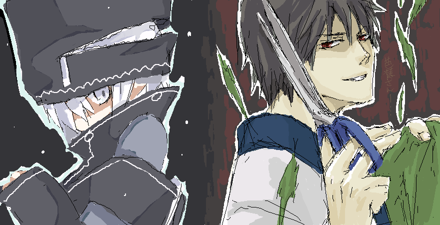 三枚目の絵は病んでいる人が題だったんだけど、見事に二人で病み方が違ってしまいました。あーさんは狂気系。俺はひきこもり系。しっかしあーさんの描くそらさんカッコいいなあ!そしてこの病み方好きだわ!